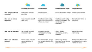 Er zijn verschillende vormen van angst. Dat is te zien op het plaatje hierboven. Hier zie je dat angst kan verschillen van lichte klachten tot een angststoornis. Hoe ernstiger de klachten, hoe groter de invloed op je leven. In het plaatje zie je voorbeelden van klachten die je kunt ervaren en voorbeelden van mogelijke oorzaken. Angst kan bij iedereen anders zijn, dus het kan zijn dat jouw klachten er anders uit zien. Angst is pas een probleem als het niet meer vanzelf weggaat. Hierna geven we nog wat meer uitleg bij het plaatje.