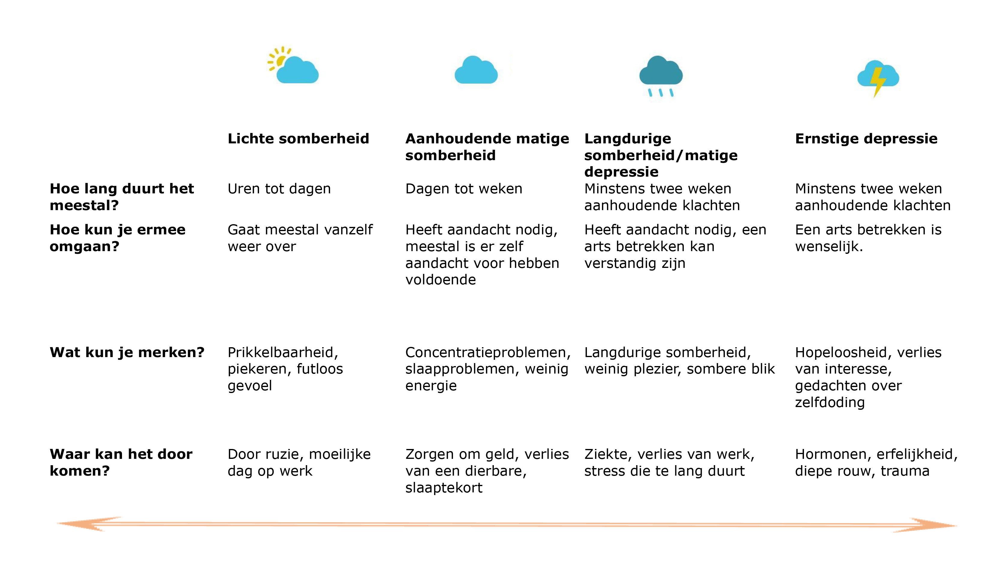 Er zijn verschillende vormen van somberheid. Dat is te zien op het plaatje hierboven. Hier zie je dat somberheid kan verschillen van lichte klachten tot een ernstige depressie. Hoe ernstiger de klachten, hoe groter de invloed op je leven. In het plaatje zie je voorbeelden van klachten die je kunt ervaren en voorbeelden van mogelijke oorzaken. Somberheid kan bij iedereen anders zijn, dus het kan zijn dat jouw klachten er anders uit zien.